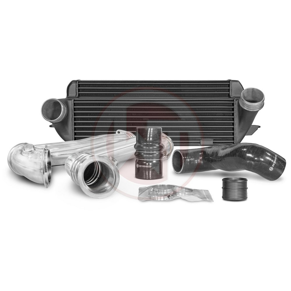 Das Competition Paket für die BMW E-Reihe besteht aus dem Ladeluftkühler Upgrade Kit EVO 2 und dem N54 Hosenrohr Kit und passt in folgenden Fahrzeugen.BMW 135i E82/E88*BMW 1er M E82*BMW 335(x)i E90/E91/E92/E93** (Nacharbeit am Kühlersupport erforderlich - Erläuterung )Ladeluftkühler Upgrade Kit 200001044Der Competition Ladeluftkühler hat folgende Netzabmaße (520mm x 210mm x 150mm / gestuft = 13,572 cm³) und bietet damit eine 85% größere Anströmfläche sowie 90% mehr Ladeluftvolumen gegenüber dem originalen Ladeluftkühler. Das neuentwickelte Competition-Hochleistungsnetz gewährt den angrenzenden Bauteilen, wie z.B. dem Wasserkühler, noch genügend Luftstrom und ist zudem noch sehr leicht (7,4kg). Im CAD entwickelte Freiform-Endkästen aus Aluminiumguss für bestmöglichen internen Luftstrom. Insgesamt hat dieser Ladeluftkühler weit aus weniger Gegendruck als der Serienkühler. Zusätzlich haben alle unsere Ladeluftkühler ein Anti-Korrosions-Beschichtung mit Wärmeleiteigenschaften. Dies garantiert eine optimale Kühlung mit deutlichem Leistungsanstieg. Die Montage erfolgt durch Austausch des OEM Ladeluftkühlers und ist einfach durchzuführen. Alle unsere Produkte unterstehen einer stetigen qualitativen Überwachung.Damit unsere EVO 2 Version in allen angegebenen Fahrzeugen passt, müssen geringe Anpassungsarbeiten durchgeführt werden.Der Kühler passt bei Fahrzeugen mit N54 & N55 Motoren. Bei Fahrzeugen mit M-Paket sind zusätzliche Anpassungsarbeiten an der Unterbodenverkleidung nötig.Lieferumfang:1 Ladeluftkühler1 Silikonschlauch Eingang, verstärkte Ausführung1 Silikonschlauch Ausgang1 Aluminiumadapter LLK-Saugrohr1 Satz 12mm Edelstahl Norma Schellen1 Montagematerial1 MontageanleitungDas Wagner-Tuning Hosenrohr-Kit BMW E8x E9x N54 MotorDurchmesser von 70mmkomplett hochwertiger Edelstahl 1.4301 (SS304)ohne Vorkat2 Lambdasondenanschlüsse je Seitemit flexiblen Ausgleich100% passgenau, einfach gegen Serienteil tauschenweniger thermische Belastung für den TurboladerMehrleistung durch Staudruckreduzierungwesentlich mehr Drehmomentpassend für alle BMW Biturbo N54 Motoren (außer Z4)Der Software Datenstand sollte angepasst werden, um die Ausgabe von Fehlercodes in der DME zu vermeiden.Nicht im Bereich der STVO zugelassen